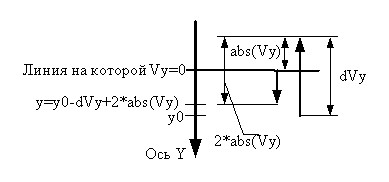 В случае если мяч двигался вправо, код будет немножко отличаться: x:=x+Vx; If x>X2 then x:=X2-(x-X2); Здесь (x-X2) – «перелёт мяча», т.е. то расстояние, на которое должен отскочить мяч. Так же стоит сказать, что относительно оси X никакие силы действовать на мяч не будут, соответственно скорость относительно оси X меняться не будет. Скорость относительно оси Y. Т.к. мы должны смоделировать поведения реального мяча, то на него должна действовать сила тяжести Из выше сказанного следует, что скорость движения мяча относительно оси Y будет меняться с каждым проходом программы. Соответственно получим следующий код для нахождения координаты y при движении мяча вниз: Vy:=Vy+dVy; y:=y+Vy; Обратите внимание, что координата y увеличивается, а не уменьшается, как мы привыкли. Это потому, что ось Y на экране направлена сверху вниз. При соударении мяча с верхней и нижней границами мяч будет отскакивать по тому же принципу, как и от левой и правой границ в случае с координатами по оси X. Однако есть один нюанс, мяч может не долететь до верхней границы в том случае, если он отскочил от нижней границы с недостаточной скоростью. Если мяч летит вверх, то его скорость уменьшается, соответственно в какой-то момент она станет равной нулю и мяч начинает падать вниз. Так как в компьютере все параметры изменяются дискретно (не плавно, а на какое-то значение), то скорость может стать отрицательной, это как раз и есть сигнал того, что мяч должен сменить направление движения. Тогда координату будем находить следующим образом: If Vy<0 then y:=y-dVy+2*Abs(Vy); Далее рисунок для наглядного понимания происходящего: