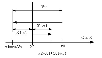 Соответственно мы можем рассматривать две скорости относительно осей X и Y отдельно друг от друга, не задумываясь о том, какая будет скорость общая. Скорость относительно оси X. Скорость – это изменение координаты за промежуток времени. Поэтому каждый раз после паузы будем увеличивать или уменьшать координату x в зависимости от направления движения. Например, при движении вправо код будет следующим: x:=x+Vx, где x – координата мяча, Vx – изменение координаты за промежуток времени равный паузе, или другими словами – скорость движения мяча относительно оси X. Направление движения будет меняться в двух случаях: при соударении мяча с левой стенкой и при соударении с правой стенкой. При этом необходимо учитывать некоторые тонкости. Расстояние до стенки может оказаться меньше, чем скорость изменения координаты. Поэтому мяч должен за этот же промежуток времени долететь до стенки и ещё вернуться обратно. Например: мяч движется влево, и в данный момент координата мяча равна 10 пикселей, при этом скорость изменения координаты равна 25 пикселей за паузу, тогда мяч должен в этот же проход отскочить от стенки на 15 пикселей. Получаем следующий код для определения координаты: x:=x-Vx; If x<X1 then x:=X1+(X1-x); Здесь X1 – координата левой стенки замкнутой области. (X1-x) – «перелёт мяча», т.е. то расстояние, на которое должен отскочить мяч от стенки. Далее приведу рисунок, который наглядно демонстрирует всё вышесказанное:
