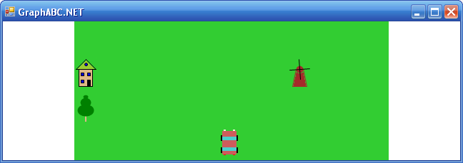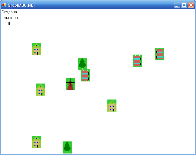 Базовый класс назовём TBase. После его описания можно приступить к описанию различных производных классов, в которых будут различные методы рисования. Эти методы почти в неизменном виде можно скопировать из программы Risunki. Для упрощения программирования самой игры, в начало этого метода можно добавить метод стирания объекта. Производным классам можно присвоить следующие идентификаторы: TDerevo, TDom, TMelnica, TMashina. Далее приведён код получившегося модуля, а так же программы, с помощью которой проверяется правильность работы написанных классов: unit MObjects; uses GraphABC,MRisunki; const X1=100; X2=540; Y1=0; Y2=480;//Координаты трассы type TBase = class polex,poley:integer;//координаты левого верхнего угла объекта shir:=30; vis:=40;//размеры объекта constructor (xx,yy:integer); begin polex:=Koor(xx,X1,X2,shir); poley:=Koor(yy,Y1,Y2,vis); clear; Draw; end; //Метод не даёт координатам выйти за пределы трассы function Koor(a,A1,A2,Razm:integer):integer; begin if (a>A1) and (a<(A2-Razm)) then Koor:=a else begin if (a<=A1) then Koor:=A1+1; if (a>=(A2-Razm)) then Koor:=A2-1-Razm; end; end; procedure clear;//стирание объекта begin MRisunki.Clear(x,y); end; procedure SetX(xx:integer); begin clear; polex:=Koor(xx,X1,X2,shir); Draw; end; procedure SetY(yy:integer); begin clear; poley:=Koor(yy,Y1,Y2,Vis); Draw; end; procedure Draw; abstract; property x:integer read polex write SetX; property y:integer read poley write SetY; end; TDerevo = class (TBase) procedure Draw;override;//Рисует дерево begin DrawDerevo(x,y); end; end; TDom = class (TBase) procedure Draw;override; //Рисует домик begin DrawDomik(x,y); end; end; TMelnica = class (TBase) procedure Draw;override;//Рисует мельницу begin DrawMelnica(x,y); DrawLopasti(x,y); end; end; TMashinka = class (TBase) procedure Draw;override; begin DrawCar(x,y); end; end; end. ========================================================== program Proverka; uses GraphABC,MObjects; var Dom:TDom; Derevo:TDerevo; Melnica:TMelnica; Mashinka:TMashinka;